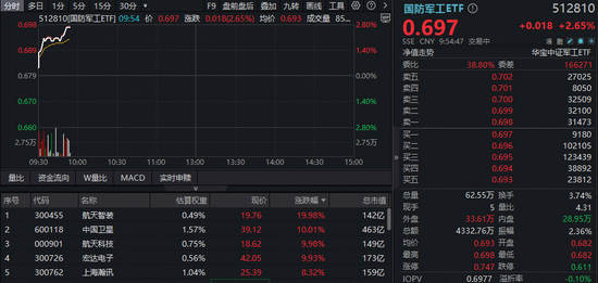 10月24日早盘,国防军工板块快速走强富盈网,核心标的国防军工ETF(512810)直线冲高2.65%!成份股方面,商业航天概念爆发,航天智装20CM涨停,中国卫星、航天科技集体10%涨停。